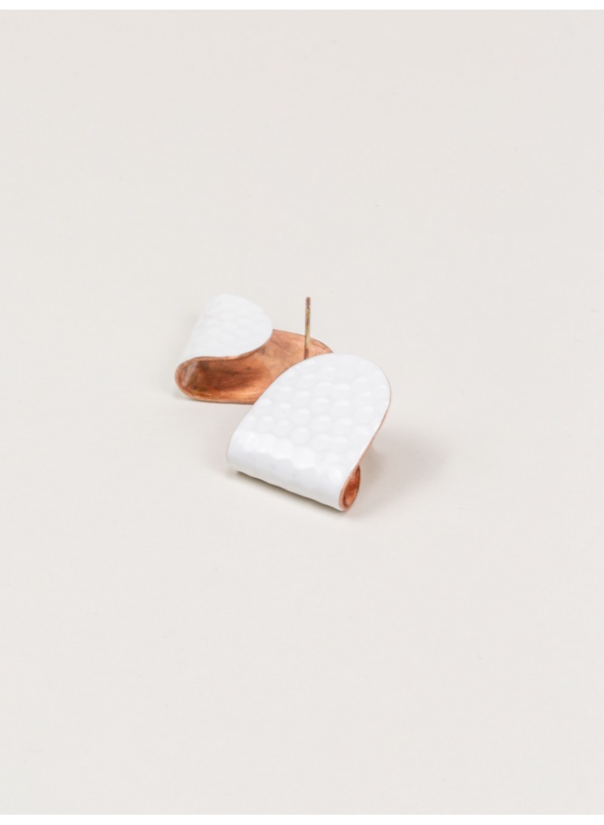 Des formes organiques. Un sublime bleu profond. Un blanc qui tranche avec le métal. Vêt Bua : une collection en cuivre martelé laqué.